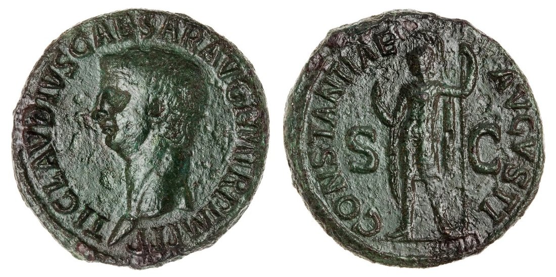 Roman Imperial. Claudius (41-54). AE As, struck 42-43. 11.4 gms. Bare head left, rev. Constantia standing left raising hand and holding spear. RIC 111. Glossy dark forest green. Very Fine.