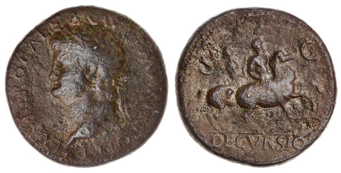 Roman Imperial. Nero (54-68). AE Sestertius. Lugdunum (Lyon, 66. 21.2 gms. Laureate head left, globe at point of neck, rev. Nero on horseback right, soldier on horseback behind, S-C; DECVRSIO in ex. RIC 508. Deep olive brown, some smoothing. Fine.
