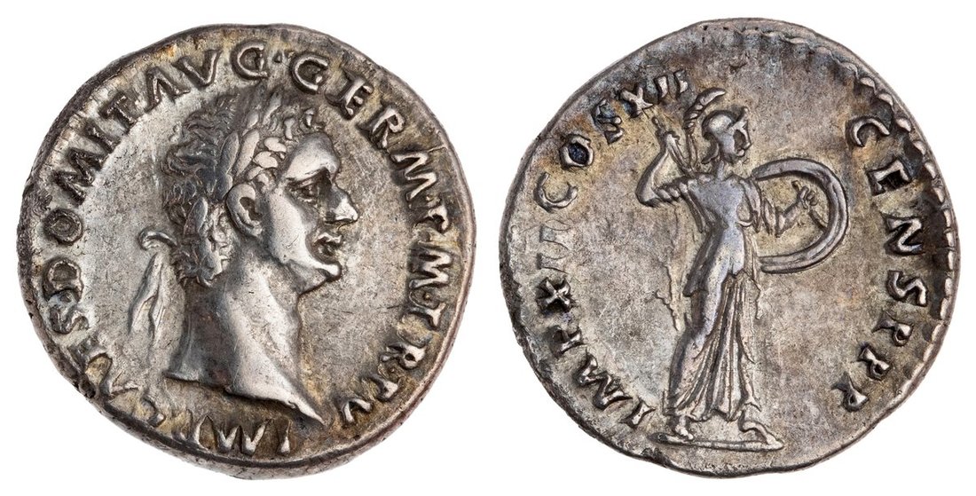 Roman Imperial. Domitian (81-96). AR Denarius, struck 86. 3.56 gm. Laureate head right, rev. Minerva standing right brandishing spear and holding shield. RIC 435. Pleasing portrait. Good Very Fine.