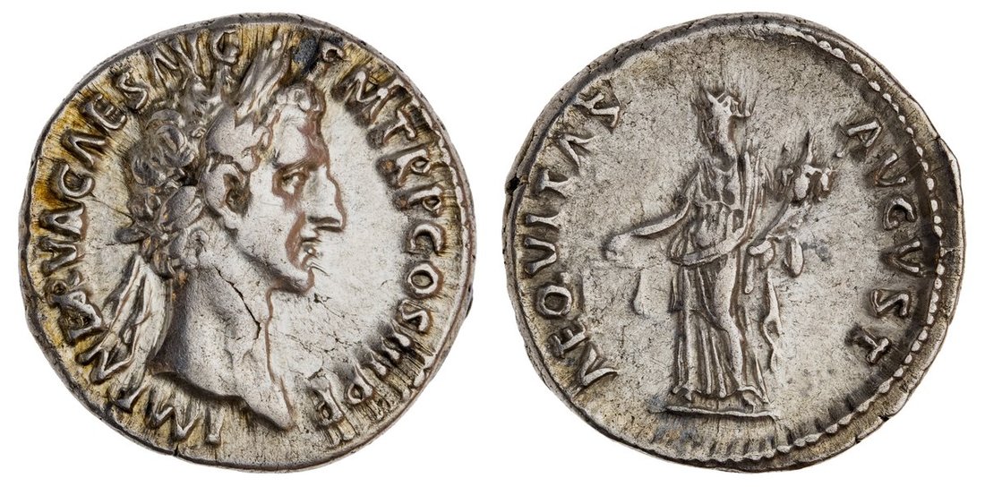 Roman Imperial. Nerva (96-98). AR Denarius, struck 97. 3.26 gm. Laureate head right, rev. Aequitas standing left holding scales and cornucopia. RIC 13, RSC 6. Small die flaw on neck. Near EF.