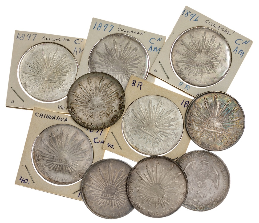 Mexico. Republica. Group of Cap 'n Rays 8 Reales: Alamos: 1890, 1895 ML; Chihuahua: 1871 MM (2), 1881 MG; Culiacan: 1879 JD, 1896, 1897 (2) AM; and Oaxaca: 1887/6 AE (adjustment marks). KM 377, 377.2, 377.3, 377.11. VF-EF. (10)