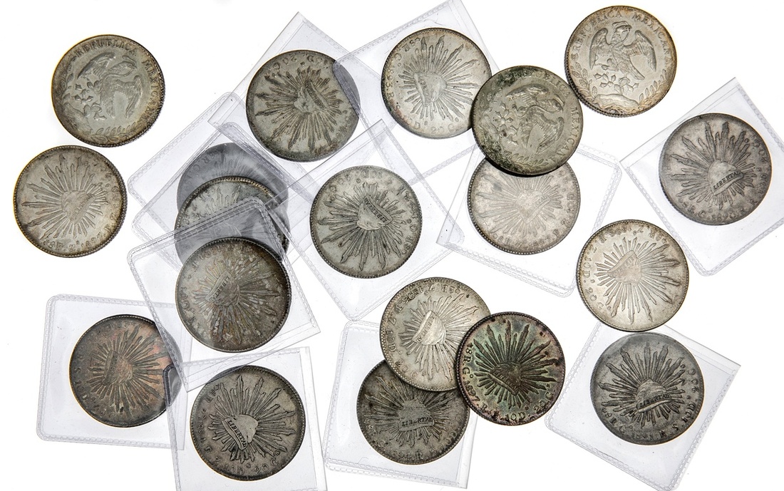 Mexico. Republica. Large lot of 1890's Guanajuato and Zacatecas mint Cap'n Rays 8 Reales. Guanajuato: 1890 RR (3), 1891 (5), 1892 (3), 1893, 1894 (3), 1895, 1896 (3), 1897 RS (8); Zacatecas: 1891, 1892, 1894 (3), 1895 (11), 1896, 1897 (5) FZ. Some with light dirt or light stain. About EF-AU. (49)