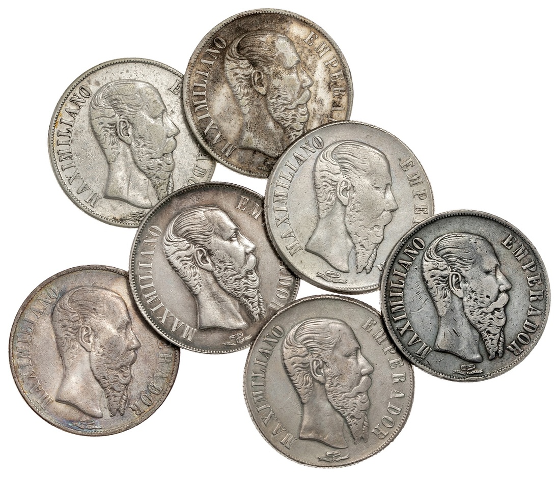 Mexico. Empire of Maximilian. Maximilian, Emperor (1864-1867). Group of Pesos, 1866 (3), 1867 (2) Mo. Mexico City; and 1866 Pi (2). San Luis Potosi. Bare head right, rev. Crowned and supported Imperial Arms. KM 388.1, 388.2. One 1867 scratch on neck, one Potosi with reverse adhesive residue. A few once cleaned. About VF-About EF. (7)