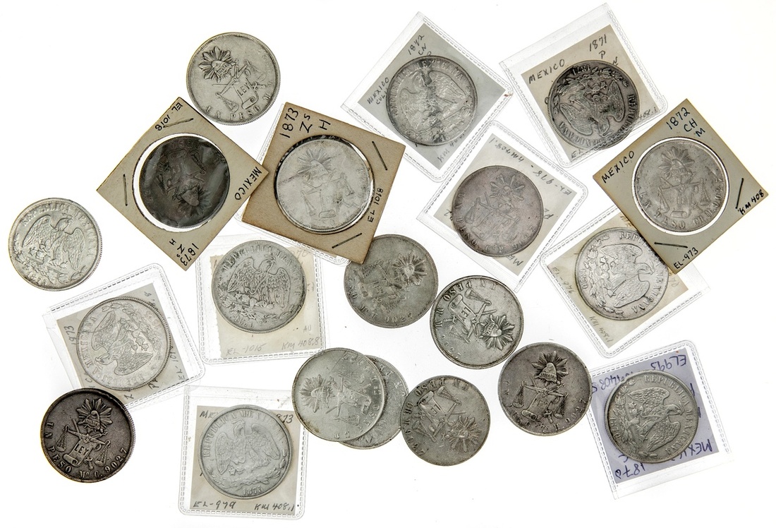 Mexico. Republica. Large lot of Balanza Pesos. Chihuahua: 1872 (4), 1873 M; Culiacan: 1870 E, 1871, 1872 (2), 1873 P; Mexico City: 1870 C (2), 1870 M (2), 1871 (2), 1872 (2), 1872/1 (3), 1873 (2) M; Zacatecas: 1870, 1871 (2), 1872, and 1873 (3) H. KM 408, 408.1, 408.5, 408.8. About VF-EF. Some once cleaned, scratches or other surface issues. (30)
