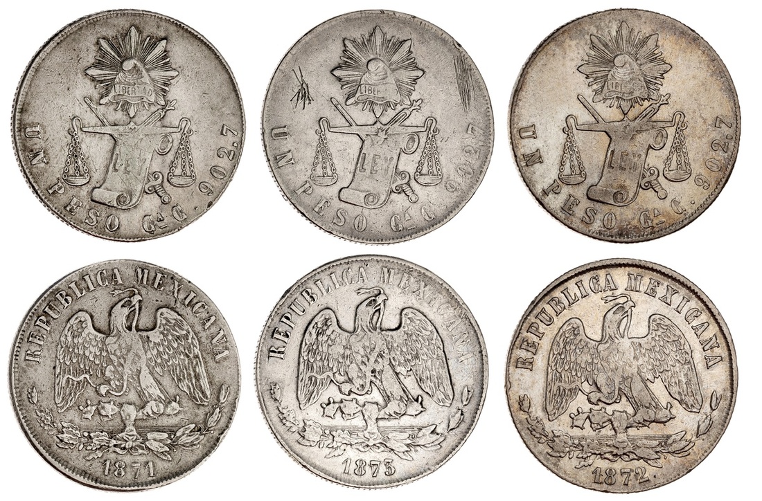 Mexico. Republica. Trio of Guadalajara mint Balanza Pesos: 1871, 1872, and 1873 C. KM 408.3. Very Fine. (3)
