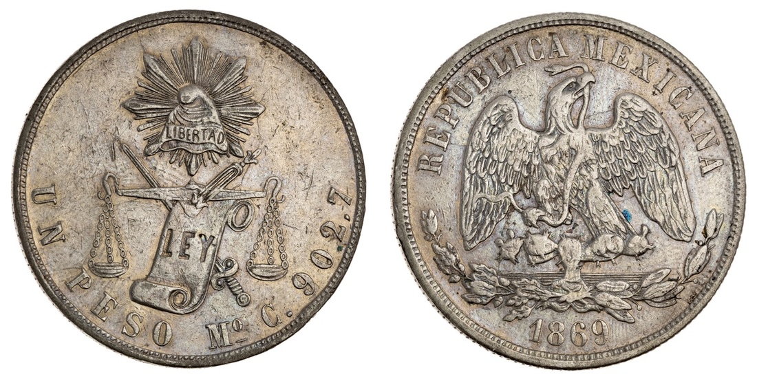 Mexico. Republica. Peso, 1869 Mo C. Mexico City. Balanza types. KM 408.5. Small toning spot. Extremely Fine.