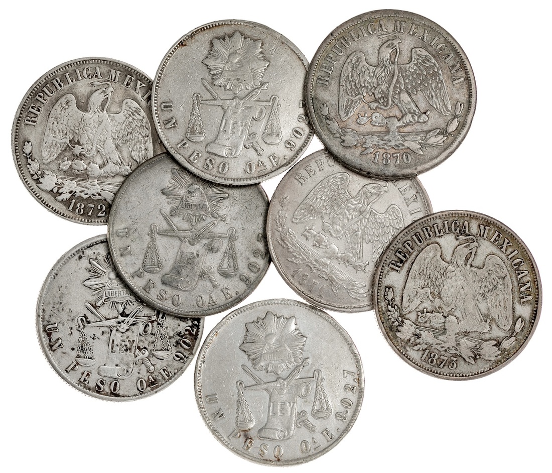 Mexico. Republica. Group of Oaxaca mint Balanza Pesos: 1870 small A, 1871 small A and large A, 1872 small A and large A, 1873 (3). Both large "A" examples About EF-EF, the others VF-EF, with a few once cleaned. KM 408.6. (8)