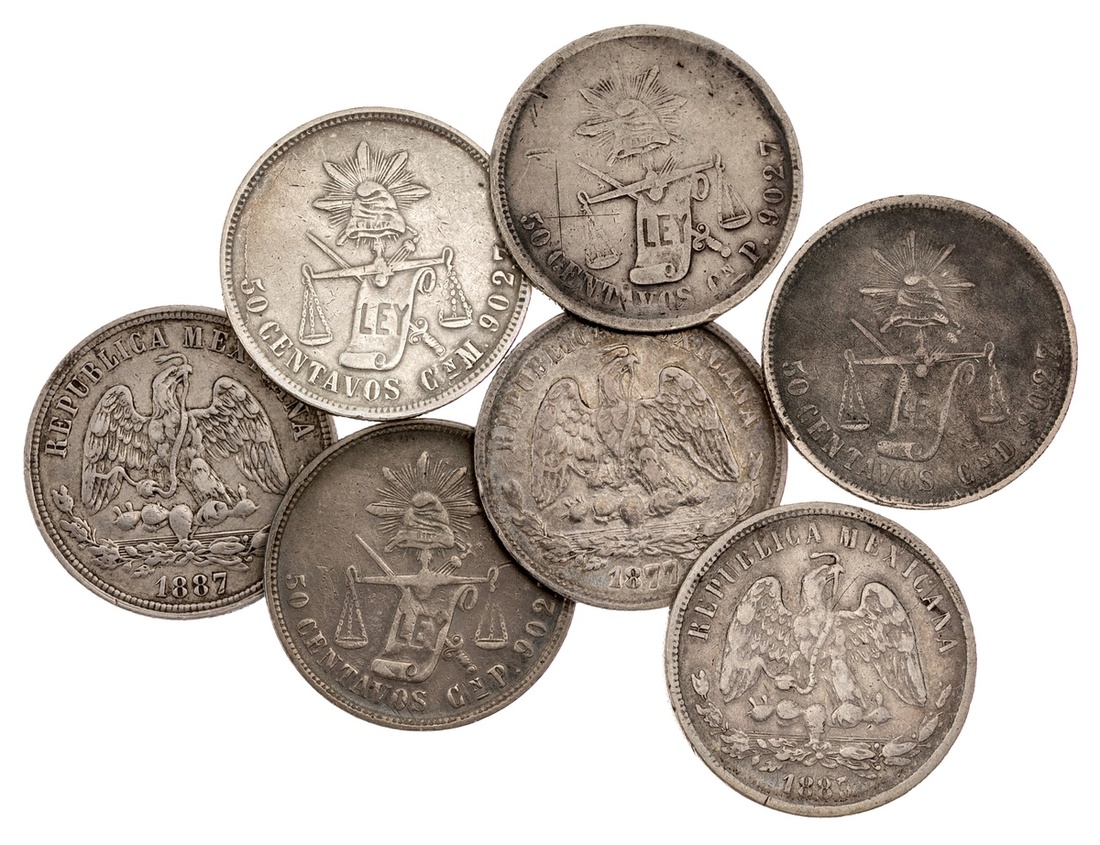 Mexico. Republica. Group of Culiacan mint 50 Centavos. 1875 (reverse scratches), 1876 (reverse scrape) P, 1877 G, 1880 D, 1883 D (a few h/l scratches), 1885/3 M/H (obverse scratch), and 1887 M. Eagle, serpent in beak, atop cactus. KM 407.2. About VF-About EF. (7)