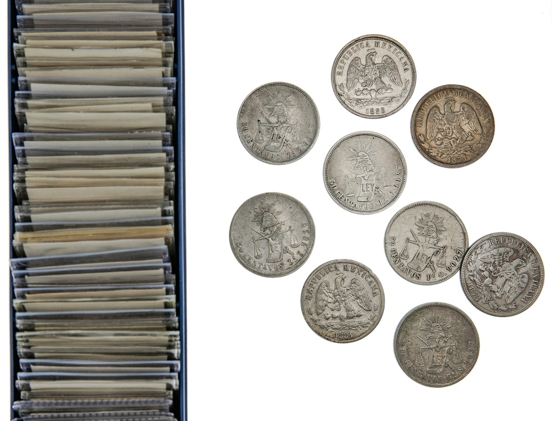 Mexico. Republica. Large lot of 50 Centavos, 1869-1894. Within each mint group, generally all different dates. Issues of the mints of: Alamos (3); Chihuahua (2); Durango (7), including 1882 C (edge bump) and 1884/2 C (2, one with reverse scrapes); Guanajuato (16); Hermosillo (4); Mexico City (10), including 1871C (obv scratches and some rim tics, VF); San Luis Potosi (11); and Zacatecas (13), including 1882 S (edge nick, some scratches, About VF) and 1887 Z (VF). Some once cleaned. About Fine-About EF. (66)