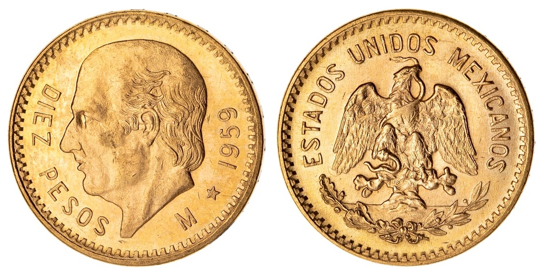 Mexico. Estados Unidos. 10 Pesos, 1959 Mo. Mexico City. Hidalgo head left. KM 473. Uncirculated.