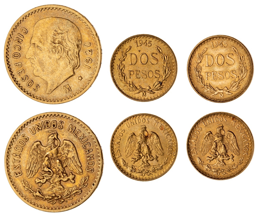 Mexico. Estados Unidos. Gold Trio. 5 Pesos, 1920 Mo. Hidalgo head left. KM 464. About EF; and 2 Pesos, 1945 Mo (2). KM 461. Uncirculated. (3)