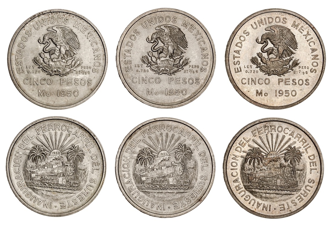 Mexico. Estados Unidos. Trio of 5 Pesos, 1950. Opening of the Southern Railroad. KM 466. Uncirculated. (3)