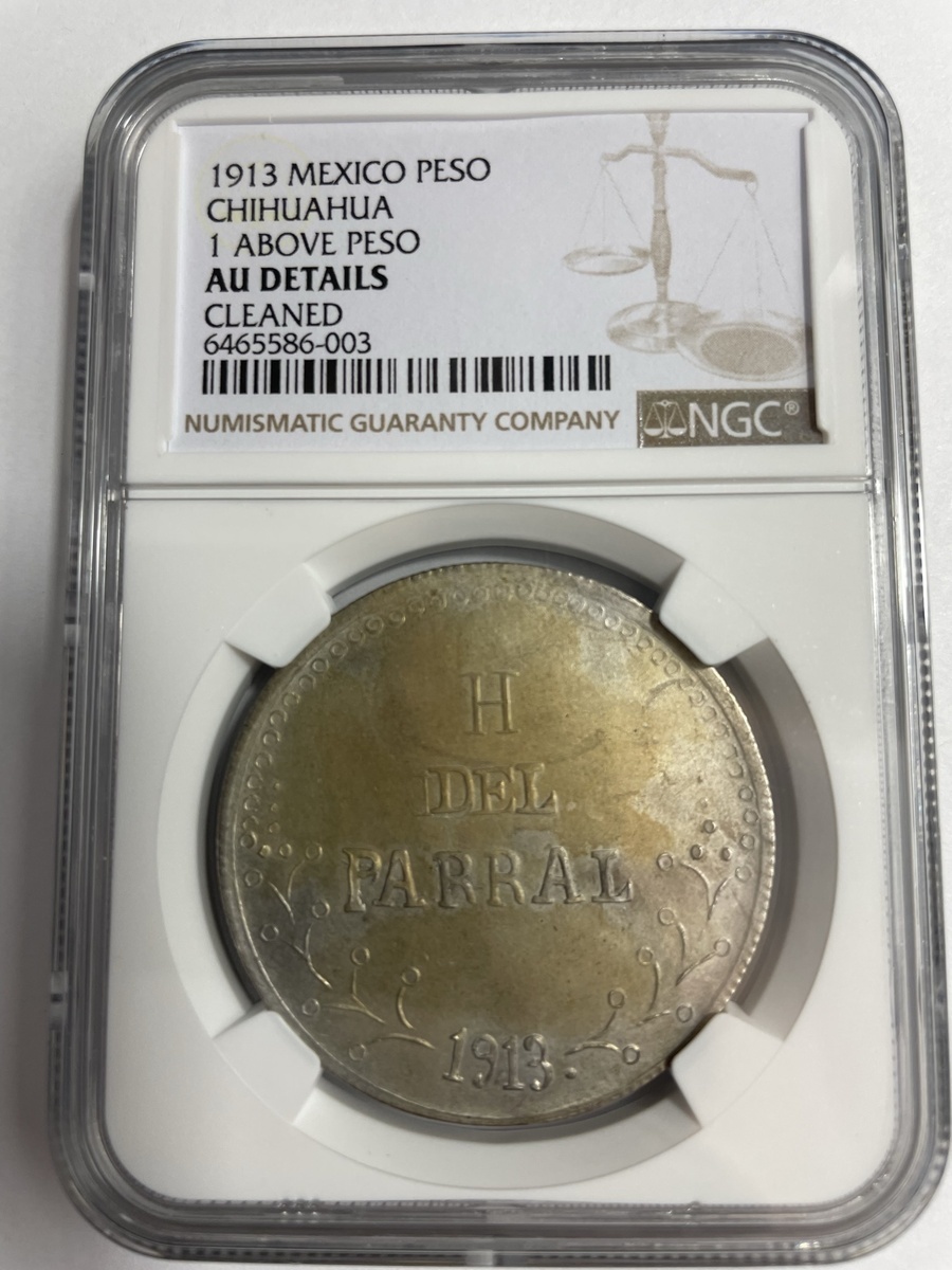 Mexico. Revolutionary. Chihuahua. Hidalgo del Parral. Peso, 1913. Legend, rev. value above spray. KM 611. NGC AU Details, cleaned.
