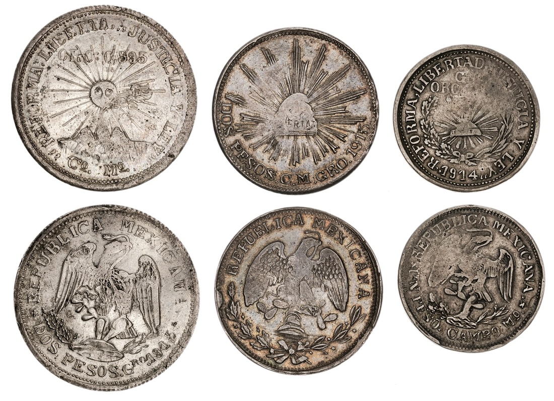 Mexico. Revolutionary. Guerrero. Campo Morado. Silver Trio: Peso, 1914 CAMPO Mo. KM 659. Crude. About VF; 2 Pesos, 1915 Co Mo. Radiant sunface over peaks reverse. KM 660. Typical weak areas, EF; and 2 Pesos, 1915. Radiant liberty cap reverse. KM 662. Very Fine. (3)