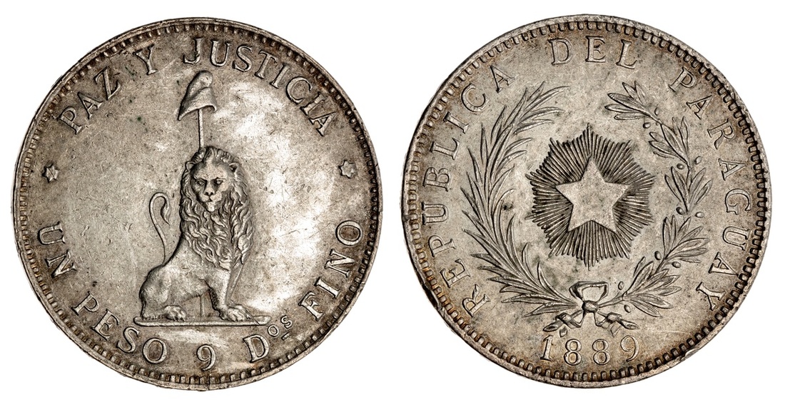 Paraguay. Republica. Peso, 1889. Lion seated facing, pole topped by liberty cap behind; radiant star within wreath. KM 5. Toned. Extremely Fine.