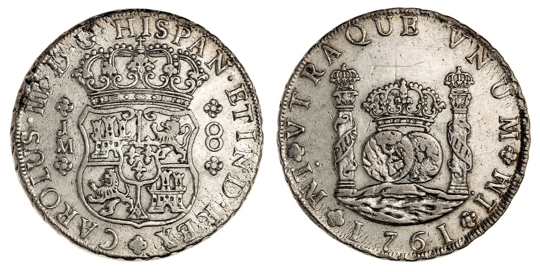Peru. Carlos III (1759-1788). 8 Reales, 1761 LM JM. Lima. Dos mundos types, dot above each "L". KM A64.2. Obverse hairlines from old cleaning. Extremely Fine.
