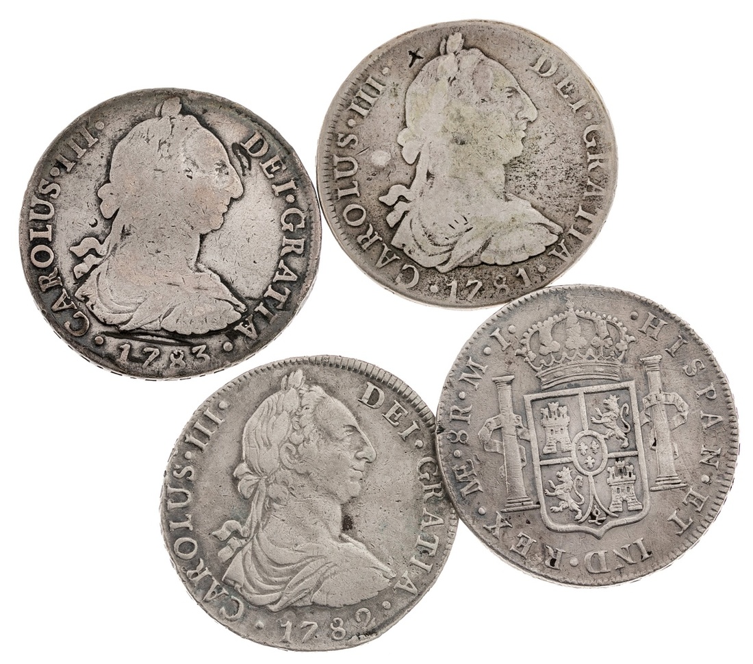 Peru. Carlos III (1759-1788). 8 Reales, 1781, 1782, 1783 and 1785 MI. Lima. Laureate, draped and armored bust right, rev. Crowned Arms flanked by Pillars. KM 78, 78a. The second cleaned, the last numerous obv. scratches, Fine- VF, the others Very Good (4)