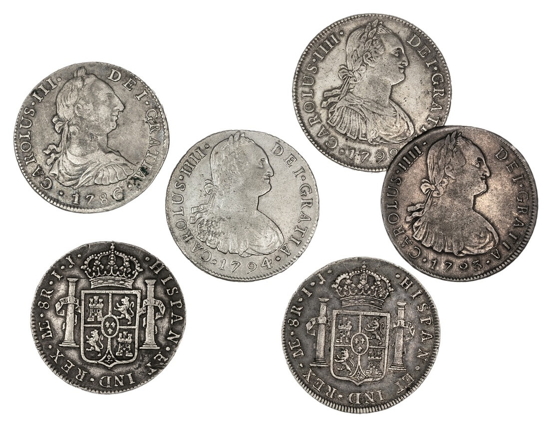 Peru. Carlos III-IV. 8 Reales, 1786 MI (cleaned, h/l), 1791 (some laminations), 1792, 1793, 1794 and 1795 IJ. Lima. Laureate, armored bust right, rev. Crowned Arms flanked by Pillars. KM 78a, 97. About VF-Good VF. (6)