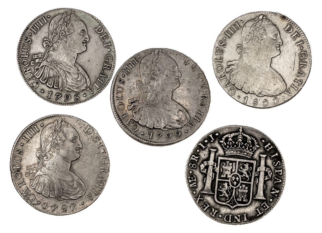 Peru. Carlos IV (1788-1808). 8 Reales, 1796, 1797, 1798, 1799 and 1800 (some obv scratches) IJ. Lima. Laureate, draped and cuirassed bust right, rev. Crowned Arms flanked by Pillars. KM 97. Very Fine. (5)