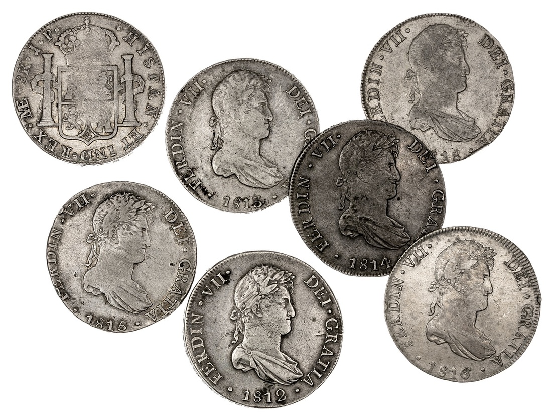 Peru. Fernando VII (1808-1822). 8 Reales, 1812 (obv scratches, rim ding), 1813, 1814, 1815 (obv scratches), 1816, 1817 (weak centers) and 1818 JP. Lima. Laureate, draped bust right, rev. Crowned Arms flanked by Pillars. KM 117.1. About VF-VF. (7)