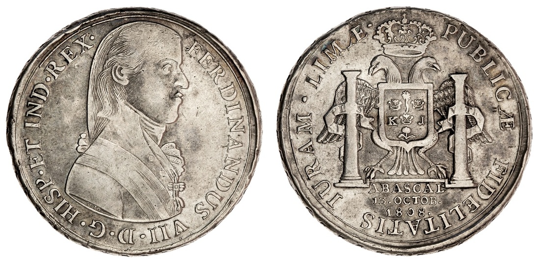 Peru. Fernando VII (1808-1822). Proclamation 8 Reales, 1808. Lima, issued by Viceroy Abascal. Silver, 39.3mm. Uniformed bust right wearing Order and sash, rev. Crowned double-headed eagle, Arms on breast flanked by Pillars. Fonrobert 8968, Medina 393, Herrera 28. Toned. About Extremely Fine.