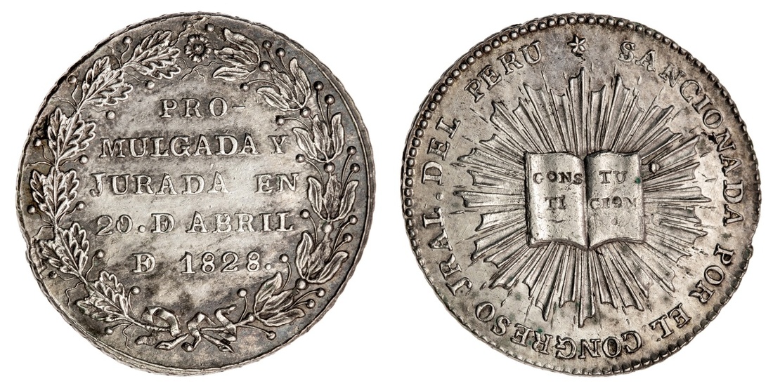 Peru. Republica. Proclamation Medal - Constitution, 1828. Silver, 28mm. Radiant book, rev. Four-line legend and date within wreath. Fonrobert 9028. Extremely Fine.
