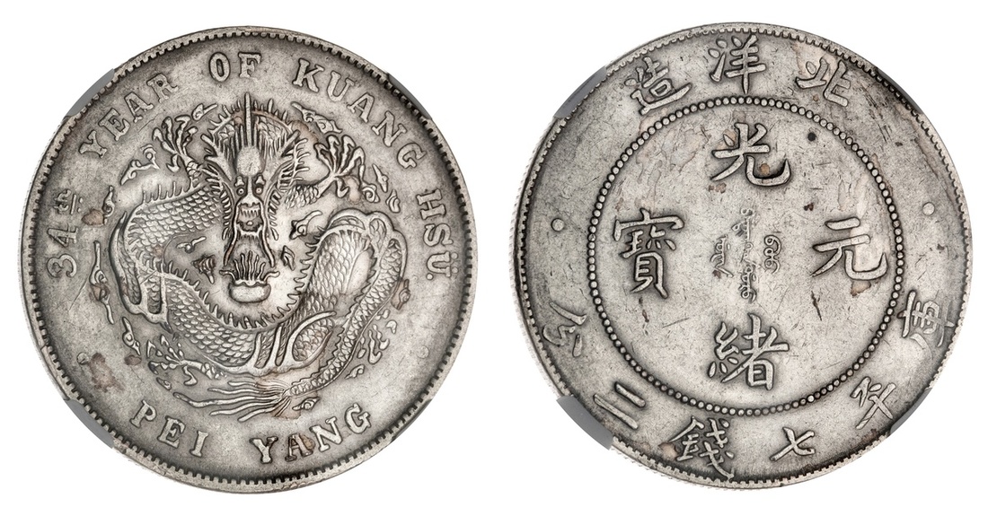 China. Imperial. Chihli Province. Dollar, year 34 (1908). Pei Yang Arsenal mint. Dragon. L&M 465, Y.73.2. NGC Unc Details, cleaned. Now toning.