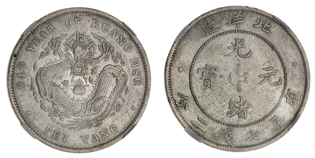 China. Imperial. Chihli Province. Dollar, year 34 (1908). Pei Yang Arsenal mint. Dragon. NGC AU 55.