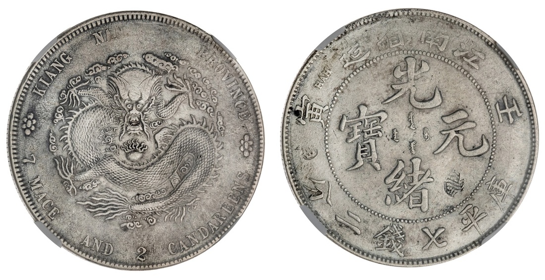 China. Imperial. Kiangnan Province. Dollar, 1902. Dragon; HAH, no dots, tiger character. L&M 248, Y.145a.8. NGC AU Details, chopmarked, cleaned. Two chops legend side, now toned a light gray.