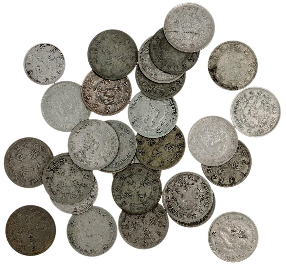 China. Imperial. Kiangnan Province. Lot of 10 Cent pieces (27): 1898 Y.142a, 142a.1 (3); 1899 Y.142a.2, 142a.3 (4); 1900 (2); 1901 Y.142a.5 (2), 142a.6 (2), 142a.7, 142a.8; 1902 Y.142a.9, 142a.10 (5); 1903; 1904; and 1905 Y.142a.14, 142a.15; also 5 Cents, 1900. VG-EF. (28)
