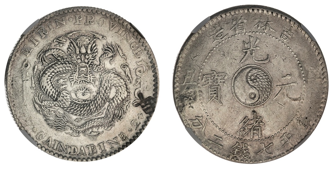 China. Imperial. Kirin Province. Dollar, 1901. Dragon, +7.CAINDARINS.2+ (retrograde "S"); yin-yang in center. L&M 536, Y.183a.1. NGC AU Details, chopmarked, cleaned (single character chop after denomination).
