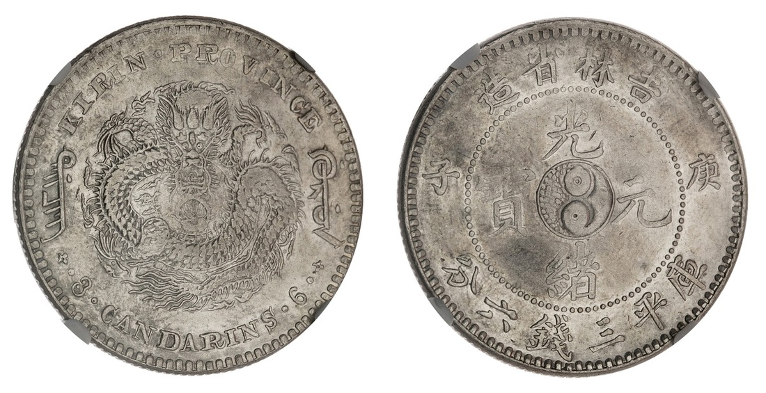 China. Imperial. Kirin Province. 50 Cents, 1900. Dragon; figure "8" yin-yang at center. L&M 527, Y.182a. NGC Unc Details, cleaned. Now toning.