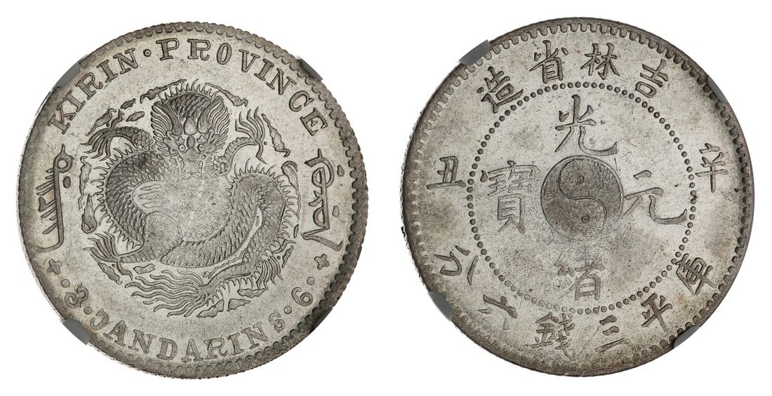 China. Imperial. Kirin Province. 50 Cents, 1901. Facing dragon; chi-lin Sheng Tsao, yin-yang at center. L&M 538, Y.182a.1. NGC AU 58.