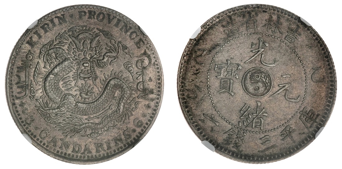 China. Imperial. Kirin Province. 50 Cents, 1905. Dragon; yin-yang at center. L&M 558, Y.182a.1. NGC AU 58. Light slate gray tone.
