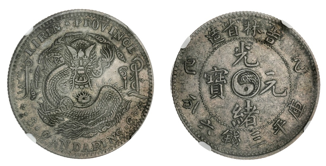 China. Imperial. Kirin Province. 50 Cents, 1905. Dragon; yin-yang at center. L&M 558, Y.182a.1. NGC AU 53. Toned deep slate gray.