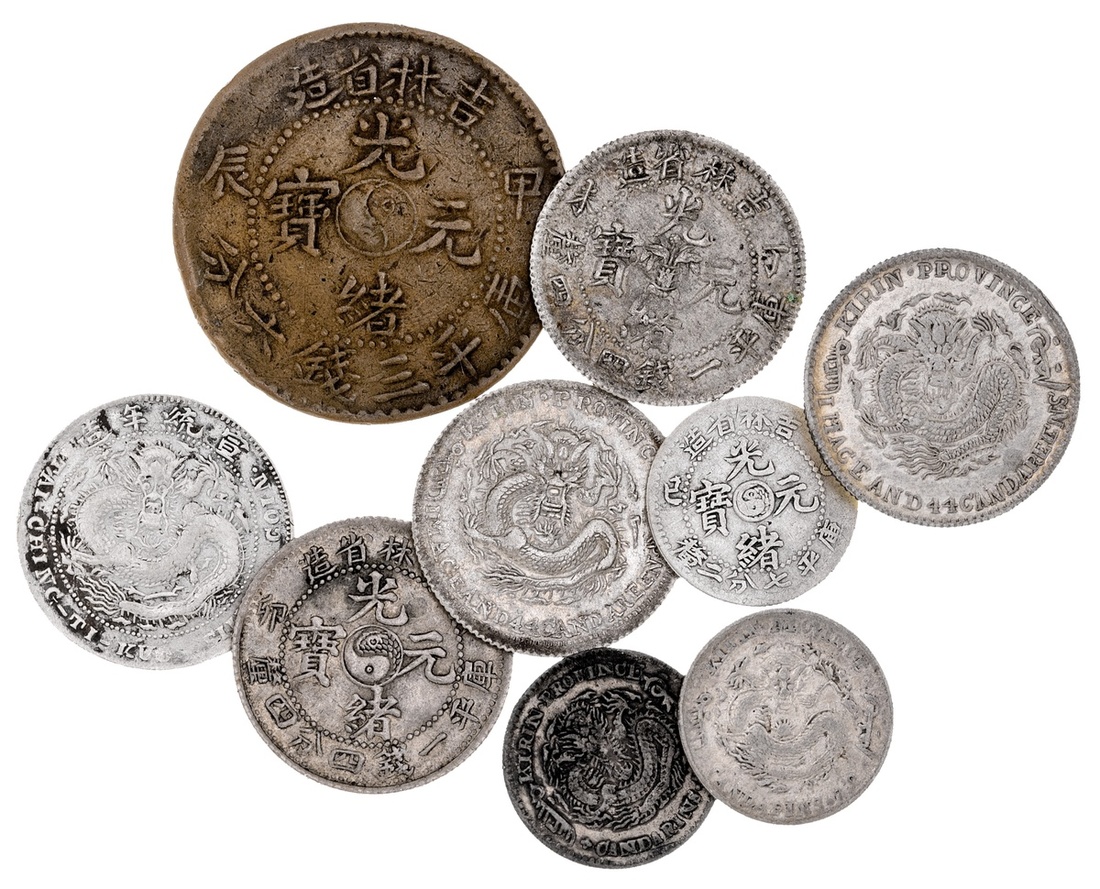 China. Imperial. Kirin Province. Lot of Silver Minors. 20 Cents -- nd (1898), 1906, 1907. Y.181. The first two ex-Kann Collection; 1903. Y.181a; Good VF-EF; nd (1909). Y.22. Reverse deposits and pinscratches. VF Details; 10 Cents - nd (1898), 1900, 1905. Y.180.1. VF; also contemporary Warlord counterfeit of a 50 Cents struck in Copper. VF. (9)