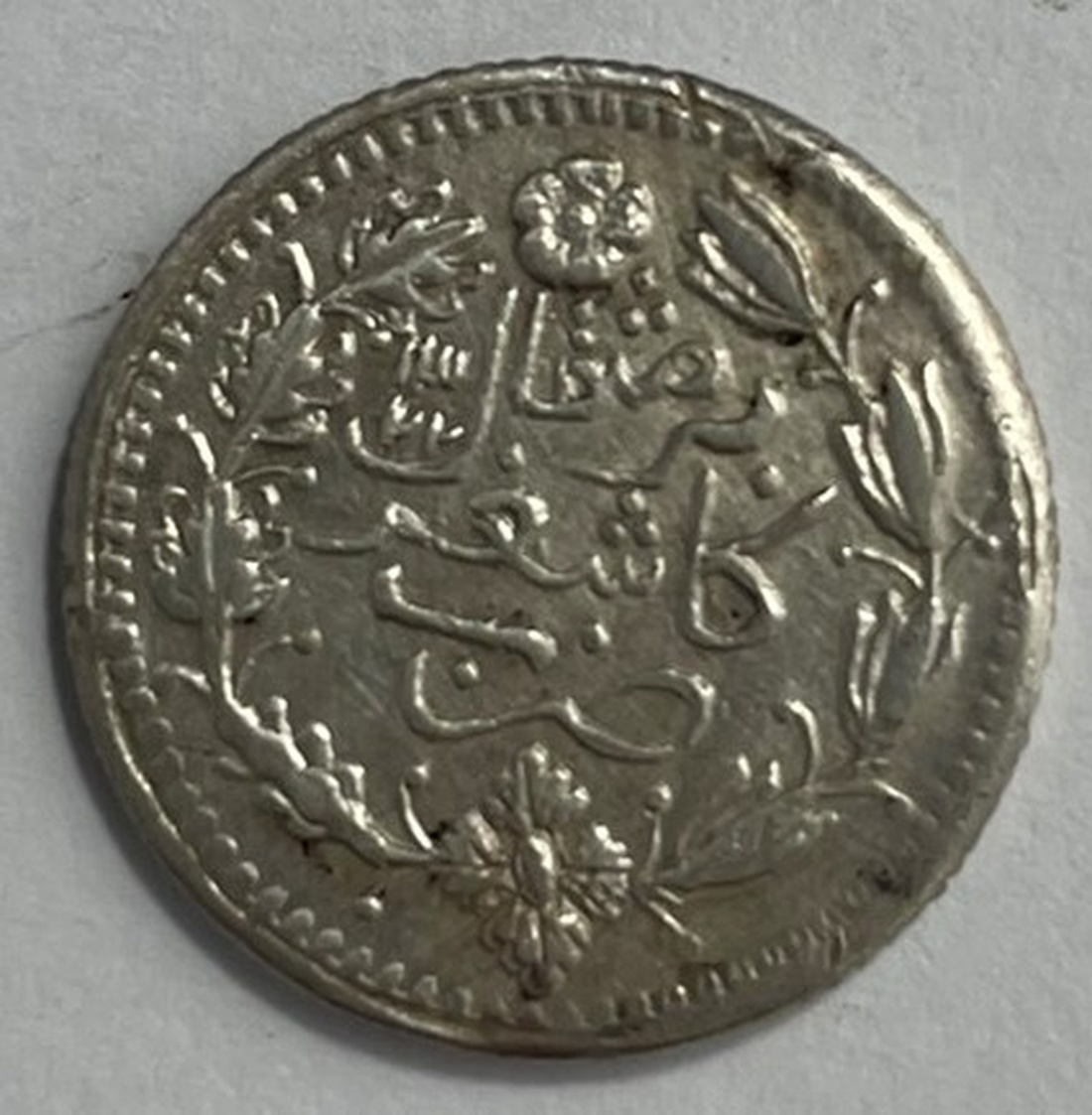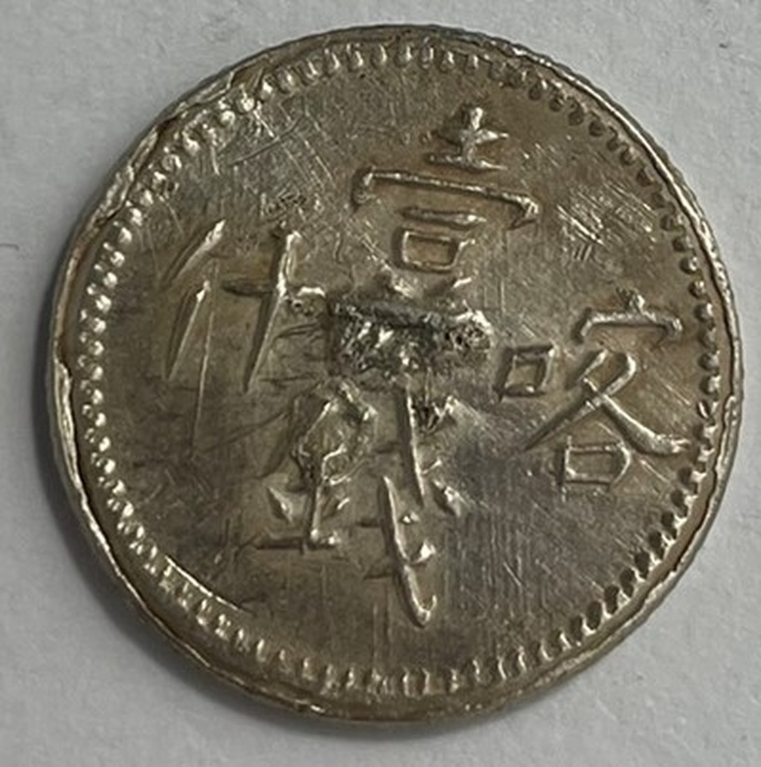 China. Imperial. Xinjiang Province (Sinkiang). Miscal, Kashgar AH 1322. Four Chinese characters, rev Value, mint and date in Turki within wreath. Y.C16, L&M 728. Mount removed obv center, harshly cleaned and buffed. Extremely Fine Details.