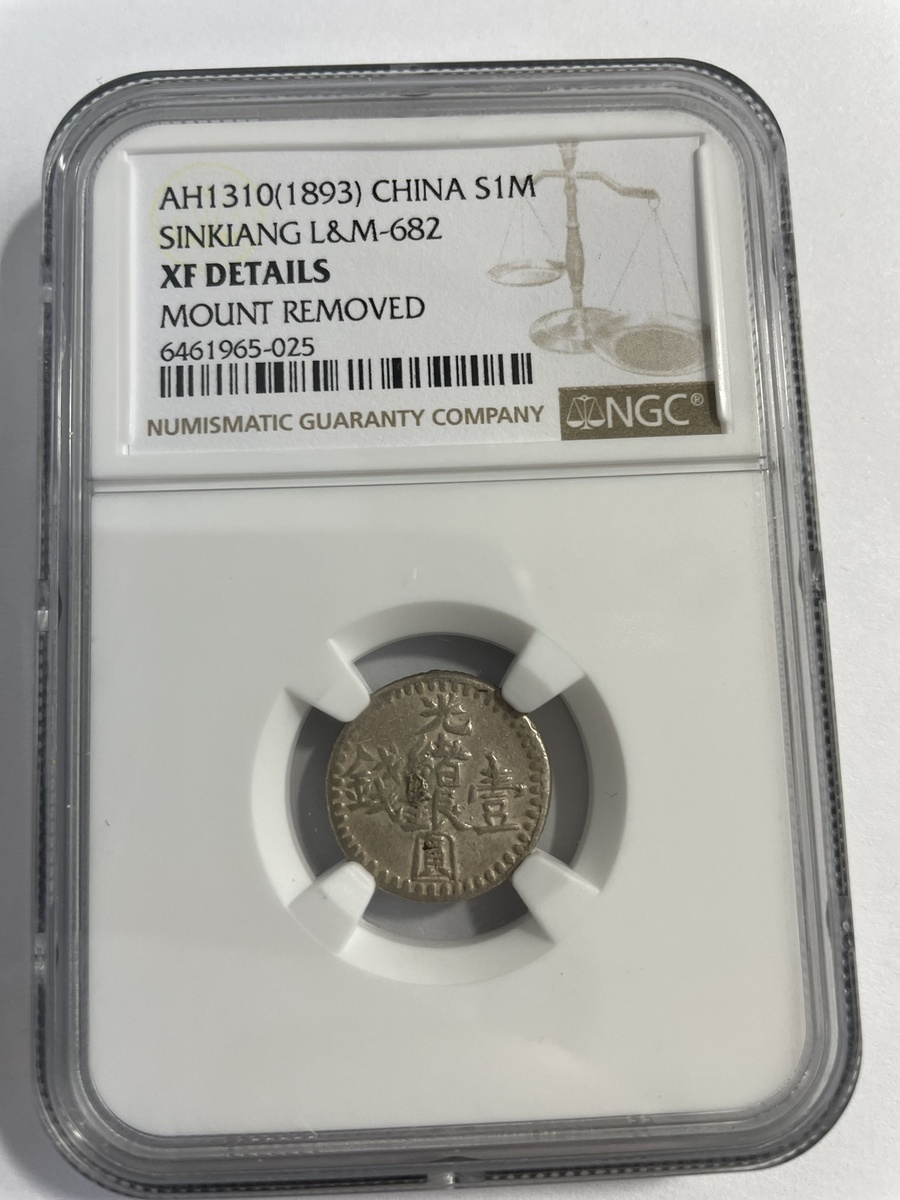 China. Imperial. Xinjiang Province (Sinkiang). Miscal, Kashgar AH 1310. Wreath around Turki legend. Rare. Y.D16, L&M 682. NGC XF Details, mount removed (from left obv center).