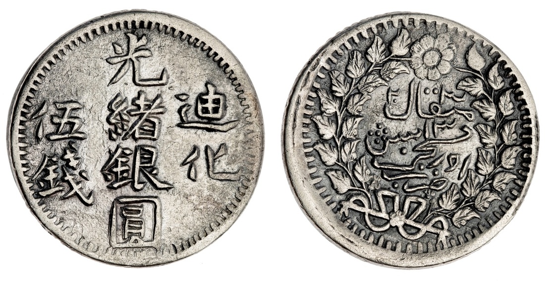 China. Xinjiang Province (Sinkiang). 5 Miscals, Ürümchi- Tihwa AH 1323 (1905). 16.12 gms. Chinese legend, official "5" at left, top right character missing bottom stroke; Uighur legend within wreath. Y.35a. Extremely Fine.