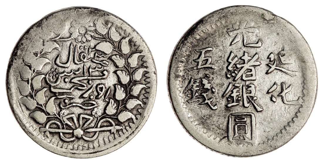 China. Xinjiang Province (Sinkiang). 5 Miscals, Ürümchi AH 1323. 17.23 gms. Chinese legend; Turki legend within wreath, "13" of date below "mithqal", "23" above it. Y.35. Faint stain in periphery. Very Fine.