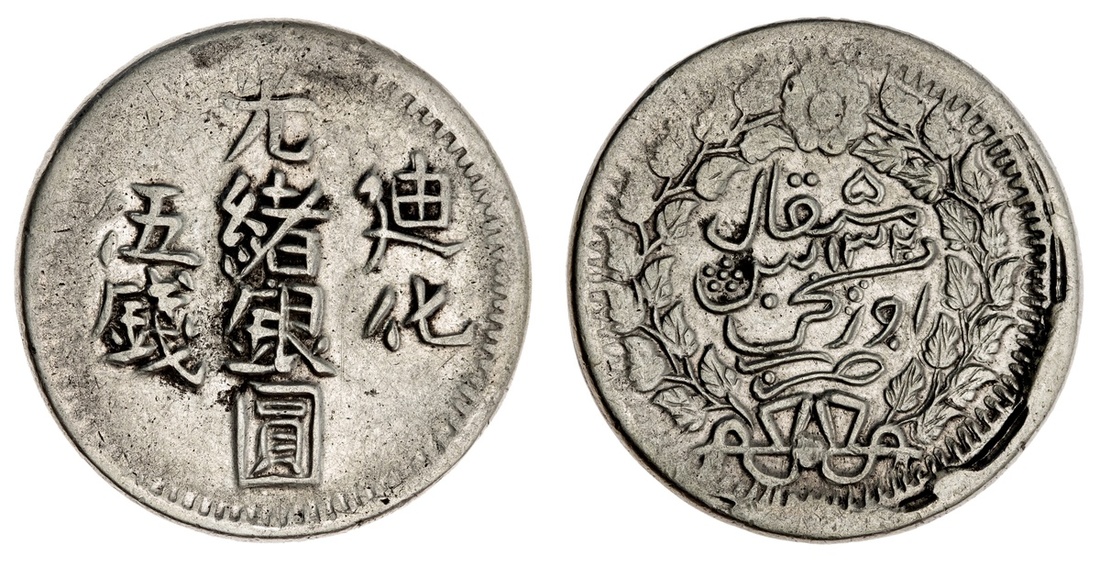 China. Xinjiang Province (Sinkiang). 5 Miscals, Ürümchi- Tihwa AH 1325 (1907). 17.5 gms. Chinese legend, official "5" at left; Uighur legend within wreath. Y.35a. Very Fine.