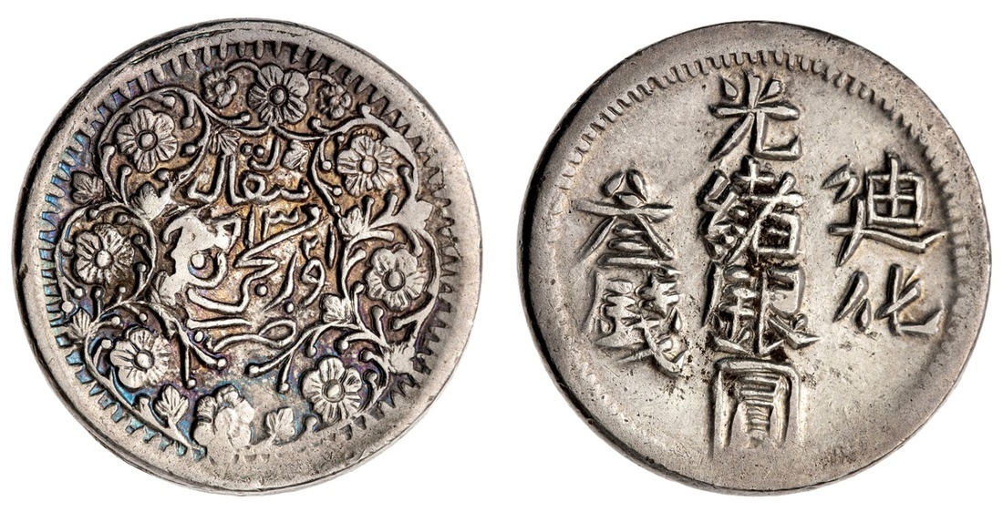 China. Xinjiang Province (Sinkiang). 3 Miscals, Ürümchi AH 1321. 10.23 gms. Chinese legend, official san at left; Turki legend within wreath. Y.34a. Toned. Extremely Fine.
