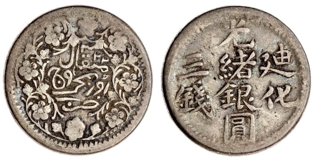 China. Xinjiang Province (Sinkiang). 3 Miscals, Ürümchi AH 1322. 10.19 gms. Chinese legend; Turki legend within date all above mithqal. Y.34. Toned. About Very Fine.