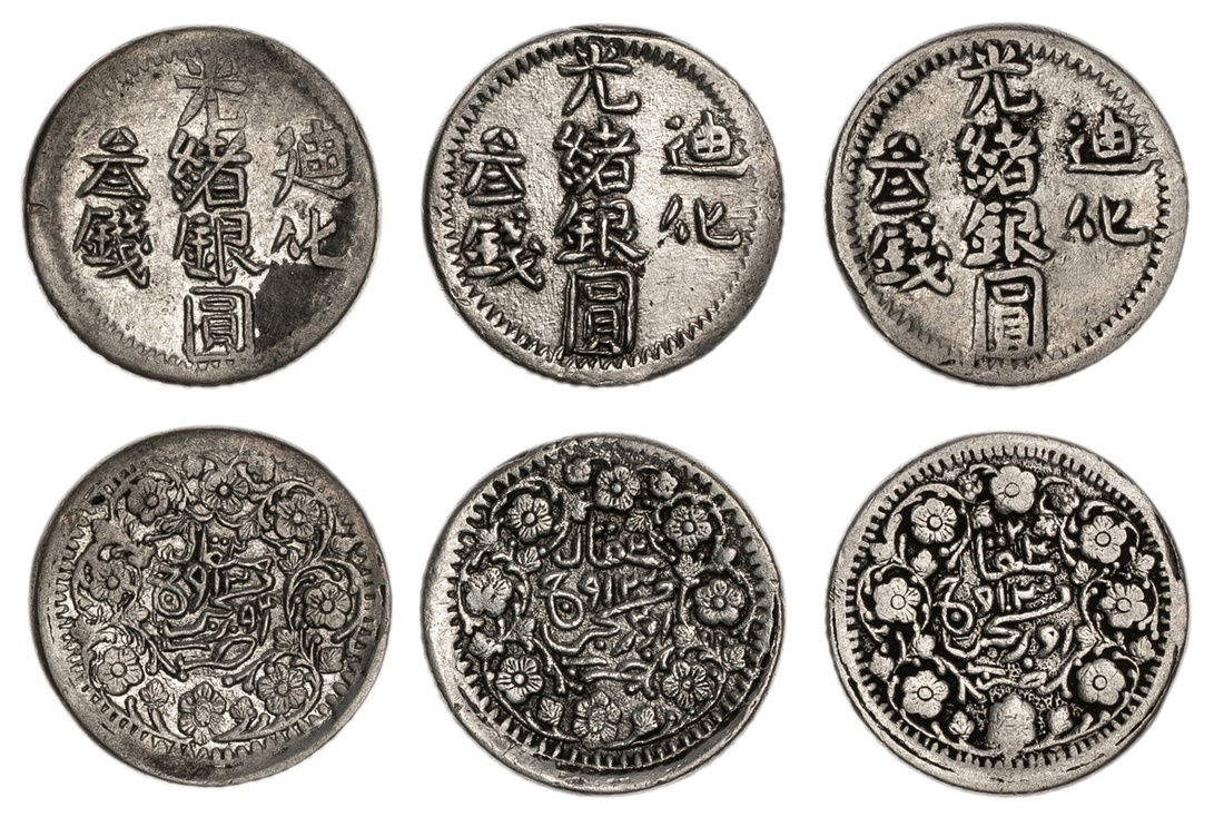 China. Xinjiang Province (Sinkiang). 3 Miscals, Ürümchi AH 1322 and 1324 (2). Official san at left. Y.34a. The first polished, one with stain. VF-About EF. (3)