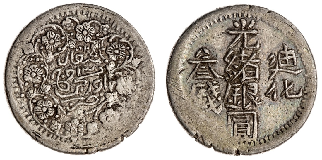 China. Xinjiang Province (Sinkiang). 3 Miscals, Ürümchi AH 1325. 10.27 gms. Chinese legend, official san at left; Turki legend within wreath. Y.34a. Slightly rough from improper annealing. Toned. About Extremely Fine.