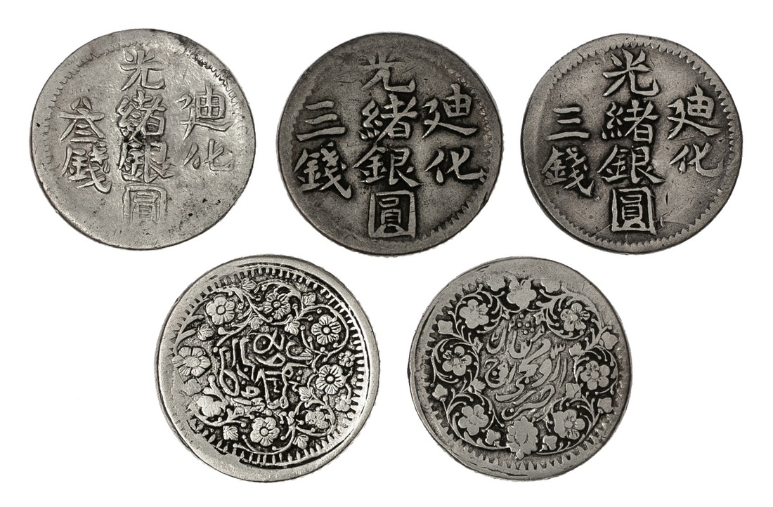 China. Xinjiang Province (Sinkiang). 3 Miscals, Ürümchi AH 1322.(3, var). Chinese legend; Turki legend within wreath. Normal san. Y.34; AH 1323, 132-. Official san at left. Y.34a. About VF-VF. (5)