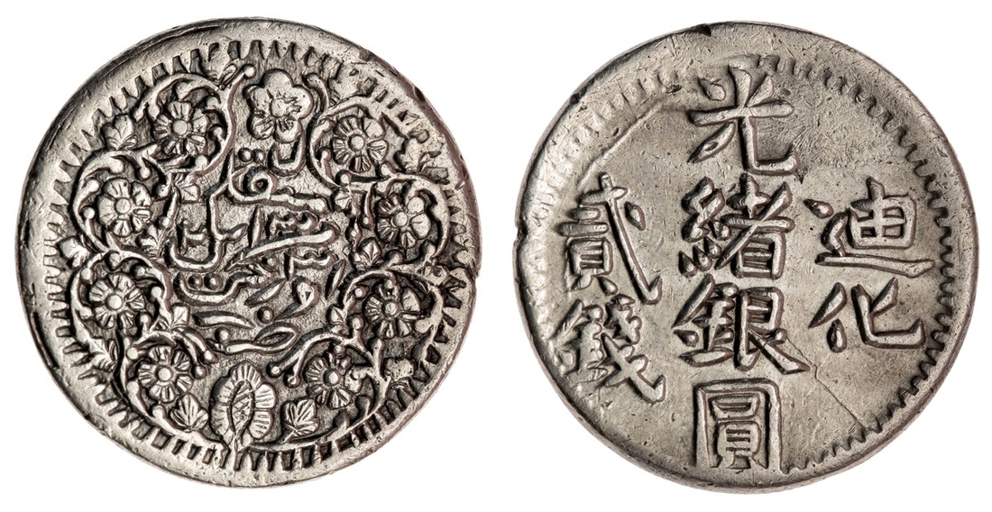 China. Xinjiang Province (Sinkiang). 2 Miscals, Ürümchi AH 1323. 6.72 gms. Chinese legend, official erh at left; Turki legend within wreath. Y.33.1. Bold strike. Choice Extremely Fine.