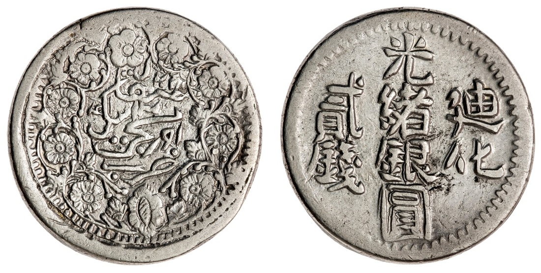 China. Xinjiang Province (Sinkiang). 2 Miscals, Ürümchi AH 1324. 6.78 gms. Chinese legend, official erh at left; Turki legend within wreath. Y.33.1. Extremely Fine.