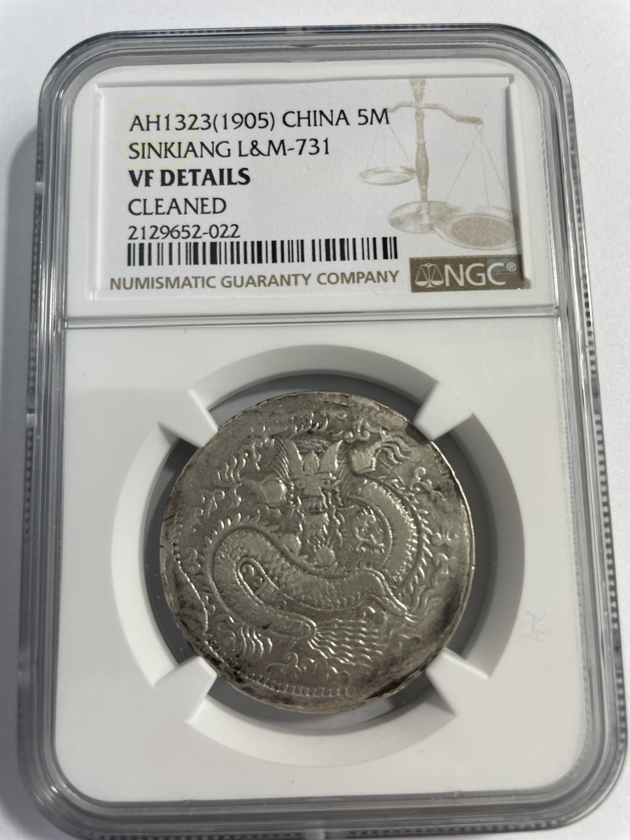 China. Imperial. Xinjiang Province (Sinkiang). 5 Miscals, Kashgar AH 1323 (1905). Large dragon; Date across upper left. Y.21, L&M 731. NGC XF Details, cleaned. Now toning.