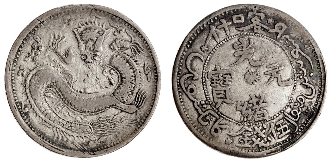 China. Imperial. Xinjiang Province (Sinkiang). 5 Miscals, Kashgar, AH 1323. Large dragon, eight streamers for tail; da qing yin bi, Turki and Chinese legends around, with official "wu", "Kashgar" in Turki at right, date widely space across bottom. Y.21var. Slate gray tone. Very Fine.